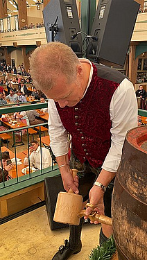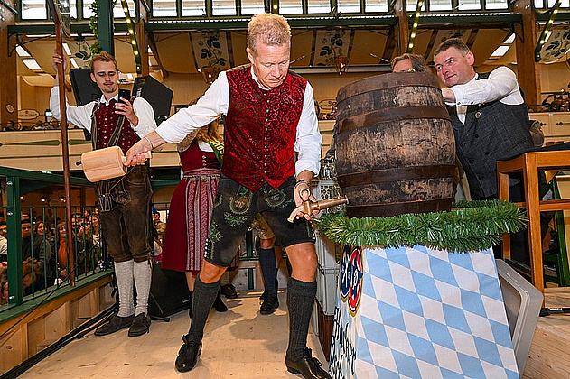 In gewohnt, geübter Manier gab sich kein geringerer als Paulaner-Chef Andreas Steinfatt persönlich die Ehre das große Holzfass auf der Bühne anzuzapfen. Die Freude war ihm ins Gesicht geschrieben, als endlich seine ersehnten Worte „ozapft is!“ durch das Zelt hallten.