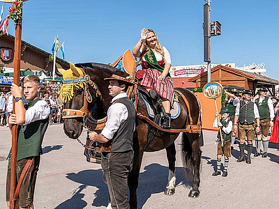 Beim großen Einzug der Wiesnwirte am ersten Samstag des Oktoberfestes führt die amtierende Bräurosl hoch zu Ross den Festzug des Zeltes an.